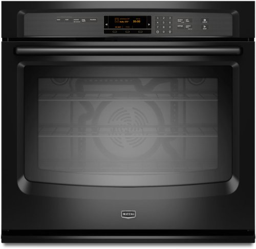 Maytag Black Wall Oven MEW9530AB. From everyday meals to large family feasts, count on the industry-leading capacity to meet all your cooking needs. This oven combines the power of the bake and broil burners and convection fan to preheat in 8 minutes. Now you can spend less time cooking food and more time enjoying it. A 10-year limited parts warranty on the oven elements ensures long-lasting performance. The FIT system streamlines installation by adjusting to almost any existing cutout without the need to move cabinets, modify trim or cut into walls. All necessary installation parts are included. From Tennessee to you, Maytag ovens are designed, engineered and assembled in America. With convection, you'll be able to roast foods up to 30% faster than a standard oven, while getting uniform browning and outstanding baking performance. Plus, Auto Conversion converts standard time and temperatures to their convection equivalents, making sure your legendary family recipes come out perfect. This cooking system combines Precise Preheat, Precise Bake and Precise Broil to provide dependable, even cooking throughout the oven for exceptional results and optimal performance. Heavy-duty roller racks feature full extension glides on ball bearings that slide out smoothly for easy access to large meals. The broil element can be adjusted for precise, consistent cooking results. The 2X Life hinges are tested to twice the normal life expectancy to help ensure years of dependability. These extra-large oven windows provide better visibility of the oven interior, allowing you to monitor cooking progress without opening the door, keeping oven temperatures steady and undisturbed. The stylish, easy-to-use 4.3 LCD touchscreen uses menu-driven functionality so users can choose a variety of innovative cooking options. Automatically cleans the oven according to a preprogrammed cycle that allows you to match the cleaning level to the amount of food buildup in the oven - light, medium or heavy. Cr